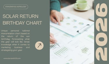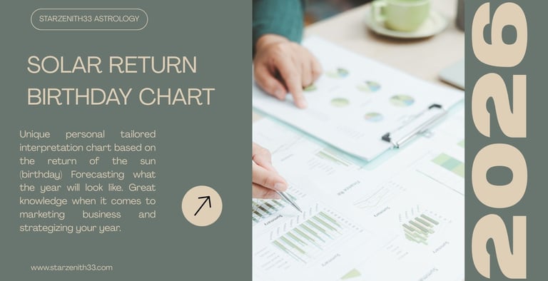 Yearly birthday forecasts, solar return charts illuminate the themes, opportunities, and turning points shaping your year ahead. Based on the moment the Sun returns to your natal position, these readings reveal where to focus your energy, when to act, and how to move through the year with clarity, intention, and cosmic advantage.