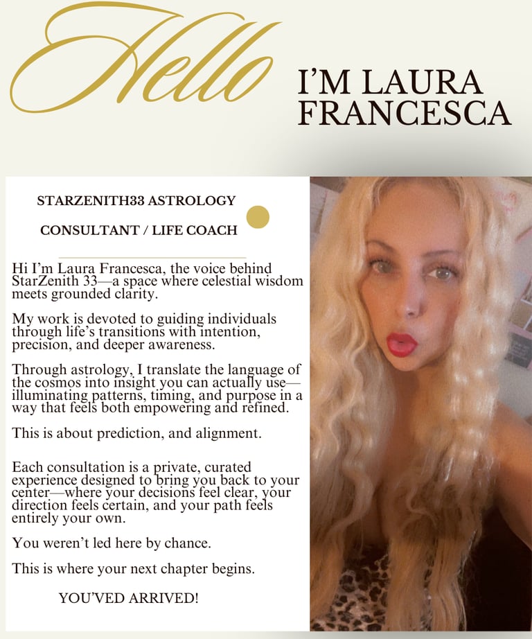 Hello! Welcome to my about me section At StarZenith33 Astrology, where every consultation is an elevated passage —where refined astrological insight meets grounded clarity.